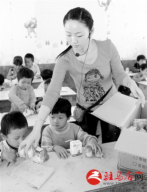 魏敏在給學生發(fā)放營養(yǎng)加餐牛奶和面包。