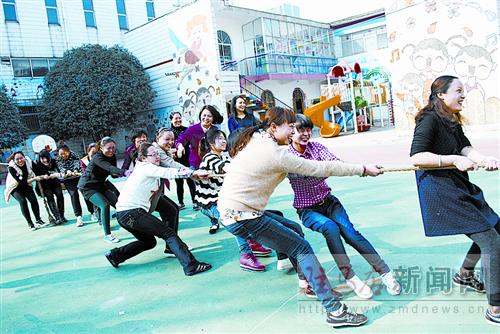 為豐富廣大教師的課余文化生活,日前,市政府機關(guān)幼兒園舉行了一場豐富多彩的文體比賽。教師們在比賽中增強了健身意識。圖為拔河比賽現(xiàn)場。 (李鵬飛 陳賀新)