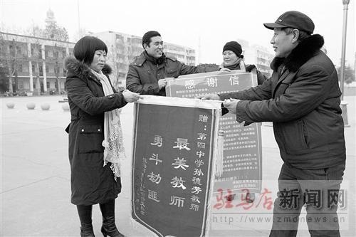 “要不是孫老師,俺花3000多元?jiǎng)傎I(mǎi)的電動(dòng)車(chē)肯定讓竊賊偷走了,真是太謝謝孫老師了。”李金鋼感激地說(shuō),“更讓我感動(dòng)的是,當(dāng)時(shí)路上行人那么多,卻沒(méi)有一個(gè)像孫老師這樣伸出援手的,更何況她還是個(gè)女同志,她這種舉動(dòng)太讓我感動(dòng)了。”“為了俺,孫老師褲子磕破了,腿也摔傷了,俺本來(lái)說(shuō)要帶她去醫(yī)院,她卻執(zhí)意不肯。”李金鋼說(shuō)。為了表達(dá)謝意,李金鋼特意給孫德芳老師制作了一面錦旗,并寫(xiě)上一封《感謝信》。李金鋼夫婦在《感謝信》里說(shuō):“感謝第四中學(xué)的領(lǐng)導(dǎo)培養(yǎng)了一個(gè)勇敢可敬的模范人物,任何言語(yǔ)已經(jīng)難以表達(dá)我心中的感激之情。第一次經(jīng)歷這樣的事情,讓我驚惶失措,而我又是如此幸運(yùn)。在此,再一次對(duì)孫德芳老師表達(dá)我最衷心的感謝,感謝我們的教師孫德芳!”李金鋼的妻子呂秀蘭也非常感動(dòng)地說(shuō):“我們和孫老師素不相識(shí),她卻不顧個(gè)人安危去抓竊賊,挽回了我們的經(jīng)濟(jì)損失。”