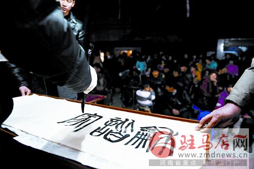 書法愛好者現(xiàn)場書寫“和諧家庭歡度佳節(jié)”。