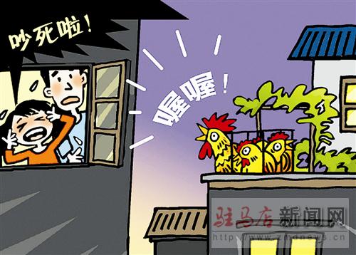 摘要: □春 鳴 兩個(gè)多月來(lái),每天凌晨,家住福州市鼓樓區(qū)某小區(qū)的街坊,就會(huì)被幾只大公雞準(zhǔn)時(shí)叫醒。該小區(qū)有一租戶在陽(yáng)臺(tái)上養(yǎng)了一群雞。日前,在街坊的投訴下,社區(qū)民警介入,責(zé)令該租戶在3天內(nèi)將雞移走。(據(jù)《海