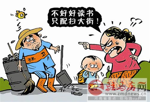 在武漢街頭,一個孩子大哭大鬧就是不想上學,媽媽氣急,鐵青著臉指著不遠處掃地的環(huán)衛(wèi)工,大聲呵斥:“你給我看著,不好好讀書,以后沒出路,只配掃大街。”男孩被媽媽的怒氣嚇住,不吭聲了。(據(jù)《武漢晚報》)