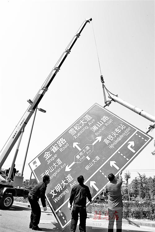 摘要: □晚報(bào)記者 蘇 莉?qū)嵙?xí)生 高 蕊 4月14日上午,在市銅山大道與置地大道交叉口附近,工作人員正在安裝新設(shè)置的指示標(biāo)志路牌。 新設(shè)置的指示標(biāo)志路牌上增加了“高鐵火車(chē)站”。