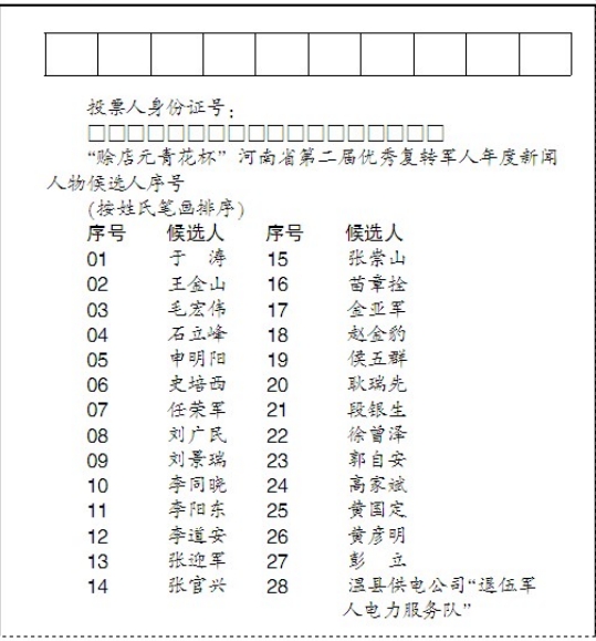主辦單位在《河南日報(bào)》、《河南日報(bào)(農(nóng)村版)》、《大河報(bào)》及大河網(wǎng)、河南國防教育網(wǎng)等媒體同步刊登“公眾投票啟事”、選票和候選人序號,候選人主要事跡見河南國防教育網(wǎng)、大河網(wǎng)。7月9日至15日,歡迎廣大群眾積極參加投票評選。如對候選人有意見,請于7月18日前向河南省優(yōu)秀復(fù)轉(zhuǎn)軍人年度新聞人物評選表彰活動組委會辦公室反映。