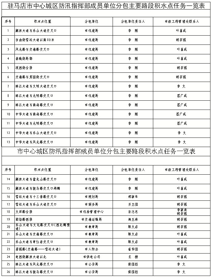 駐馬店市中心城區(qū)防汛指揮部成員單位分包主要路段積水點任務一覽表