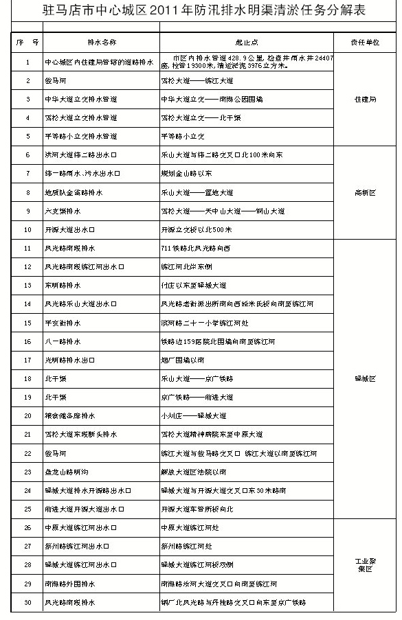 駐馬店市中心城區(qū)2011年防汛排水明渠清淤任務(wù)分解表