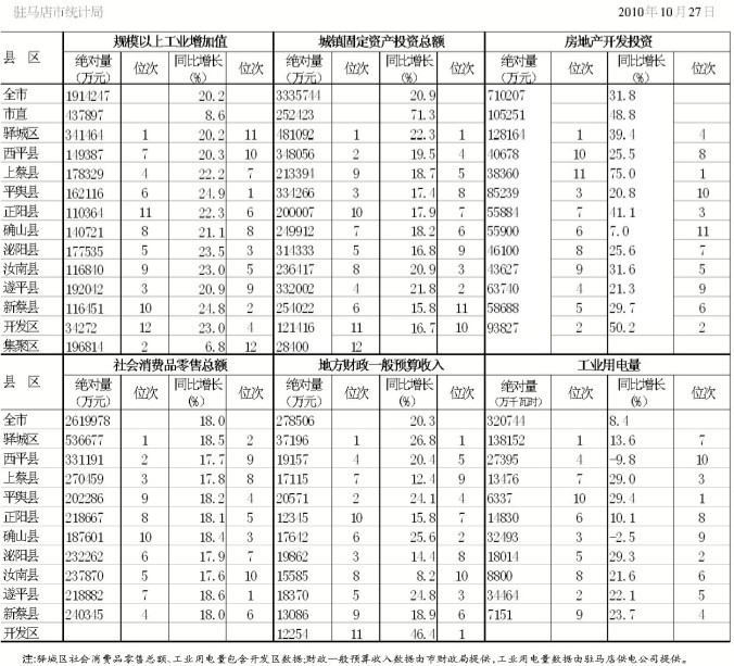 2010年1~9月份駐馬店市各縣區(qū)主要統(tǒng)計(jì)指標(biāo)及位次