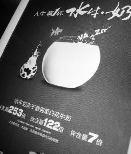 在上海的樓宇宣傳廣告中,皇氏乳業(yè)稱摩拉菲爾“水牛奶高于普通黑白花牛奶,維生素A含量253倍,鐵含量122倍,鋅含量7倍”。上述廣告中稱,這些數(shù)據(jù)源于《中國水牛科學(xué)》、《液態(tài)奶》、《乳品制造學(xué)》。