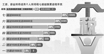 摘要: 采訪人:本報(bào)記者 李麗輝 解讀人:國(guó)家稅務(wù)總局有關(guān)負(fù)責(zé)人 工資、薪金所得,以每月收入額減除費(fèi)用3500元后的余額為應(yīng)納稅所得額,適用超額累進(jìn)稅率,稅率為3%至45%。圖為各階段收入個(gè)稅計(jì)算分析?! ?/p>