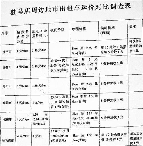 據(jù)了解,此次出租車運(yùn)價(jià)調(diào)整只有一套方案。如按照此方案調(diào)整,我市出租車的起步價(jià)5元/2公里,超出2公里每公里1.4元。調(diào)整后,我市的出租車運(yùn)價(jià)趕超漯河、南陽(yáng)、信陽(yáng)等城市,進(jìn)入全省前列。