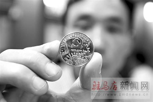 為紀(jì)念建黨90周年,近日,工行駐馬店分行發(fā)售了中國共產(chǎn)黨成立90周年紀(jì)念幣。該紀(jì)念幣面額為5元,直徑為30毫米,總發(fā)行數(shù)量為6000萬枚。圖為工行駐馬店分行工作人員展示紀(jì)念幣。記者 高圓圓 攝