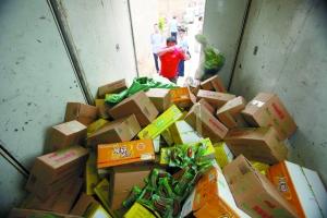 工作人員把過(guò)期食品搬上貨車(chē)。