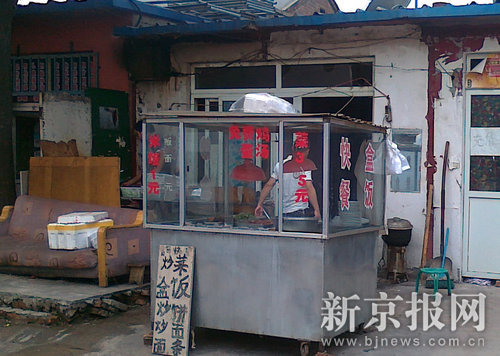 這家快餐店沒有招牌,廚房就在快餐店門口。店門口放著一個(gè)玻璃展示柜,柜子下面放有一塊木牌,上寫“炒菜、盒飯”等字樣。該快餐店廚師就是買貨男子。