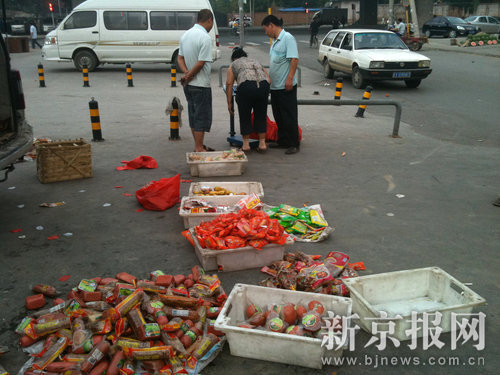 昨晨5時(shí)許,大興區(qū)舊宮鎮(zhèn)萬源吉慶農(nóng)副產(chǎn)品市場(chǎng)南門口,一家商販將大量商品倒在地上,有各類散裝或箱裝的香腸,還有密封包裝的豬蹄、骨肉相連、咸水鴨等。有的火腿腸已腐爛變黑,透出一股腐臭味。部分產(chǎn)品外包裝已破損,有的粘有黑色的污漬。