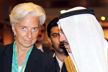 11日,法國經(jīng)濟、財政與工業(yè)部長克里斯蒂娜·拉加德(左)在沙特阿拉伯城市吉達舉行一次聯(lián)合新聞發(fā)布會前與沙特阿拉伯貨幣總署署長穆罕默德·賈西爾交談。 此前,她剛剛結(jié)束對巴西、印度、中國和葡萄牙的訪問。