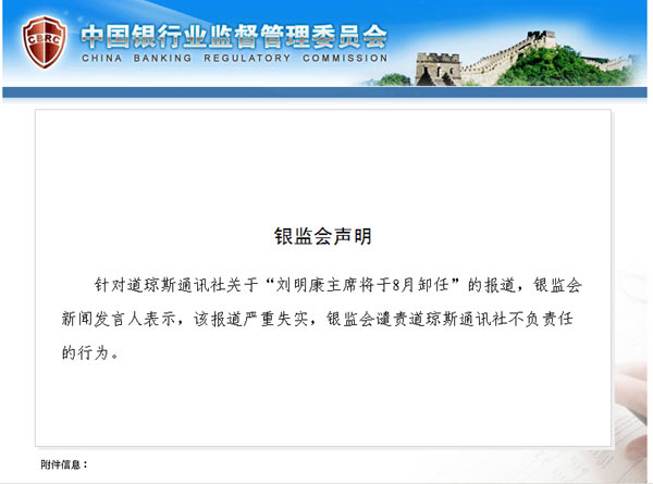 銀監(jiān)會譴責道瓊斯通訊社 劉明康8月卸任報道嚴重失實