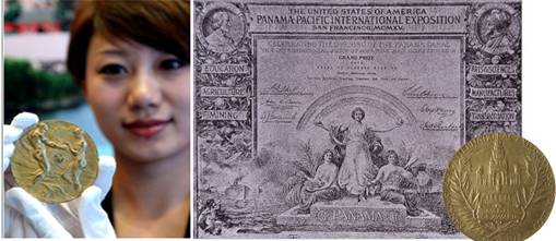 圖為張?jiān)T?span>1915年獲得的巴拿馬萬國博覽會金獎獎牌與獎狀。(圖片提供:張?jiān)#?/font>