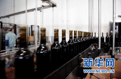 圖為張?jiān)RM(jìn)的世界一流的每小時(shí)可灌裝15000瓶葡萄酒的現(xiàn)代化灌裝生產(chǎn)線。新華網(wǎng)李欣 攝。