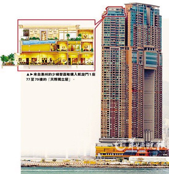 來自惠州的少婦黎嘉敏購入凱旋門1座77至79樓的“天際獨(dú)立屋”