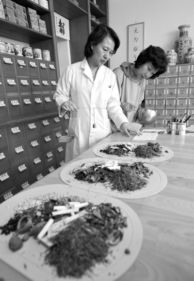 歐盟植物藥指令對(duì)德國(guó)中醫(yī)藥業(yè)影響有限。在德國(guó)柏林的蓮荷堂中藥行,醫(yī)生戴北燕和她的助手唐思佳(右)給病人抓藥。戴北燕的中藥行以食品身份銷(xiāo)售草藥,已經(jīng)經(jīng)營(yíng)了15年,在柏林小有名氣。