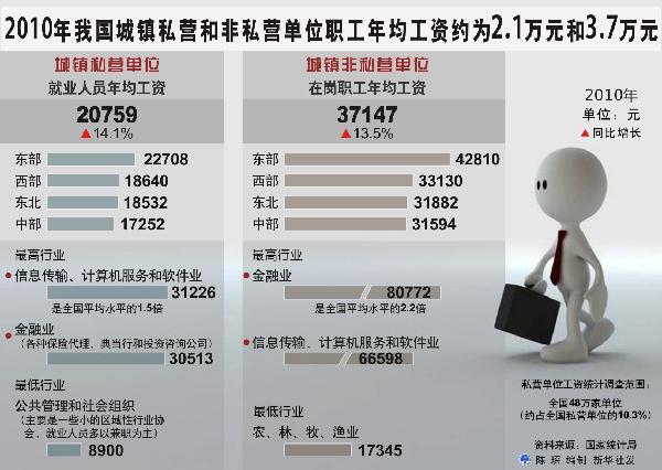 國(guó)家統(tǒng)計(jì)局昨天發(fā)布的數(shù)據(jù)顯示,2010年我國(guó)城鎮(zhèn)私營(yíng)單位就業(yè)人員和非私營(yíng)單位在崗職工年平均工資分別為20759元和37147元,同比分別增長(zhǎng)14.1%和13.5%,增幅均超過去年GDP增速(10.3%)。分行業(yè)看,金融和IT業(yè)的工資水平仍位居各行業(yè)的前兩名。