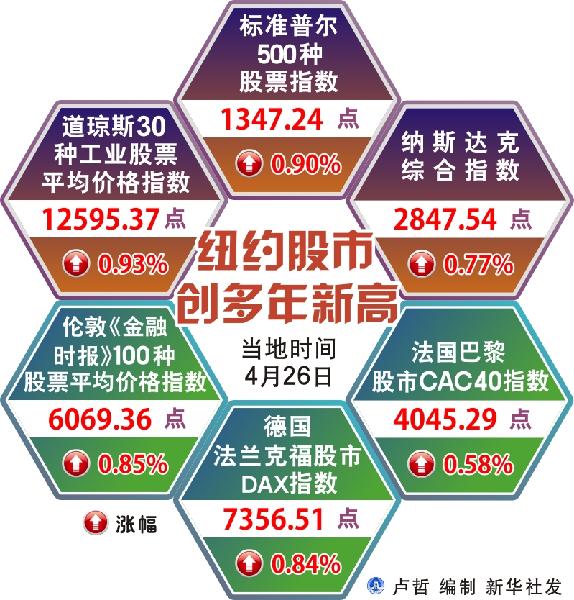 新華網(wǎng)紐約4月26日電(記者俞靚)受公司第一季度利好財(cái)報(bào)持續(xù)提振,26日紐約股市全線上漲,三大股指均創(chuàng)下多年來收盤新高。