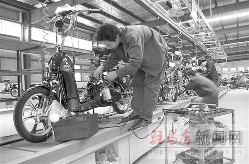 摘要: 4月15日,汝南立奧車業(yè)有限公司的工人在工作。該公司坐落于汝南縣工業(yè)園區(qū),占地20畝,年生產(chǎn)10萬輛電動自行車。記者 李
