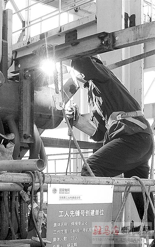 近日,國(guó)電駐馬店熱電廠2×330MW機(jī)組擴(kuò)建工程建設(shè)已進(jìn)入最后攻堅(jiān)階段,為加快進(jìn)度,建設(shè)單位開(kāi)展了“爭(zhēng)創(chuàng)工人先鋒號(hào)”勞動(dòng)競(jìng)賽活動(dòng)。圖為工作人員在