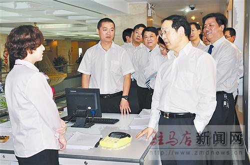 工商銀行河南省分行行長劉衛(wèi)星(右二)在工商銀行駐馬店分行行長余志偉(右一)的陪同下指導(dǎo)該行工作。