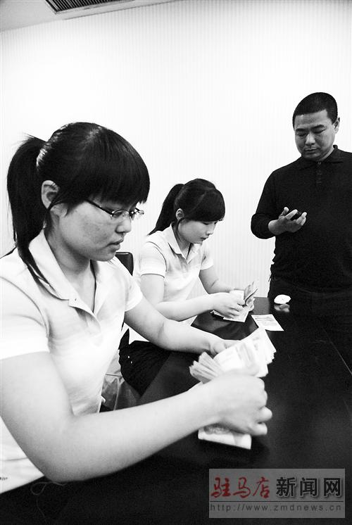 各縣區(qū)參賽隊(duì)員在進(jìn)行人民幣真?zhèn)舞b別測(cè)試比賽。