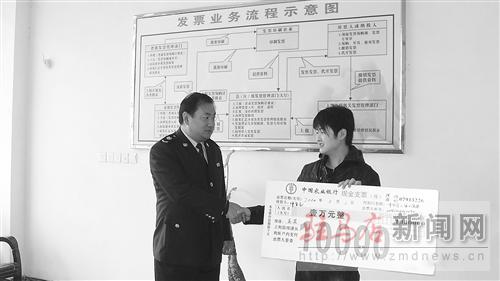 在地稅工作人員驗(yàn)明發(fā)票真?zhèn)?、身份證件后,師先生按照有關(guān)法規(guī)繳納了2000元的個(gè)人所得稅。市地稅局發(fā)票管理局有關(guān)負(fù)責(zé)人親手把10000元獎(jiǎng)金遞到師先生手中,并感謝師先生對(duì)地稅工作的支持。