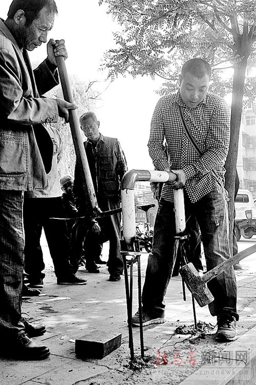 市市政工程管理處的監(jiān)察人員說(shuō),1個(gè)星期前,該路口西北角的人行道上被附近的商家安裝了欄桿。監(jiān)察部門曾下發(fā)整改通知書,但至今商家無(wú)動(dòng)靜。記者在現(xiàn)場(chǎng)看到,監(jiān)察人員將60余個(gè)護(hù)欄一一拆除。