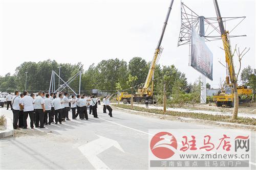近日,記者在市區(qū)開(kāi)源大道東段看到,市城建監(jiān)察支隊(duì)組織100多名執(zhí)法人員正在對(duì)一處違規(guī)廣告塔進(jìn)行拆除。