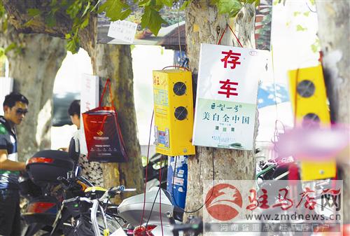 在風(fēng)光路的樹(shù)上掛滿了充電器和存車牌子。