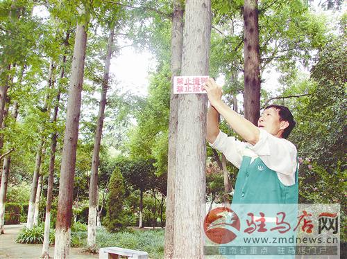近日,為了制止這些行為,公園一方面安排人員提前上班,對晨練群眾進行勸說引導(dǎo);一方面在樹上懸掛提示牌告知群眾保護樹木。記者 吳 波 攝