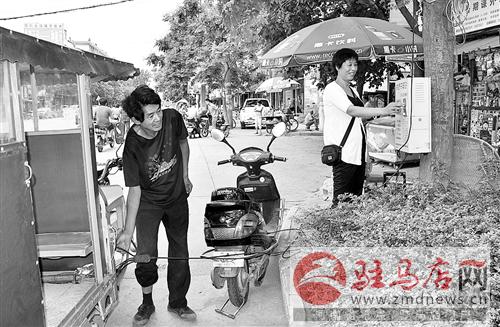 “老板,充兩元錢的。”昨日上午,家住驛城區(qū)劉閣街道的趙杰對(duì)市交通路一報(bào)亭老板說。由于電量不足,趙杰在市區(qū)辦完事后無法騎電動(dòng)三輪車回家,便就近找了個(gè)快速充電站,給電動(dòng)三輪車充電。