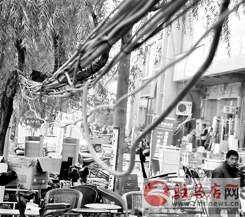 昨日,記者在該家屬院大門口發(fā)現(xiàn),進(jìn)出家屬院的車輛和行人很多,電纜垂落下來,懸在半空中,最低處距離地面不足1米,比旁邊的垂柳枝還低。記者數(shù)了一下垂落的電纜,有11根。附近一商鋪老板張先生告訴記者,他曾給通信、有線電視等多家單位反映,他們都說不歸自己管。