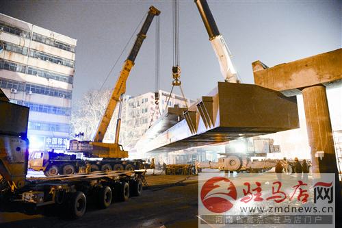 摘要: 3月2日零時(shí)許,市樂(lè)山大道與健康路交叉口過(guò)街天橋主梁吊裝成功。晚報(bào)記者 閆宏偉/攝
