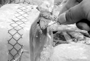 包裝膜和金屬環(huán)是在問(wèn)題火腿的內(nèi)部接近中心的位置,緊緊和火腿肉攪在一起,難以用手拽出。