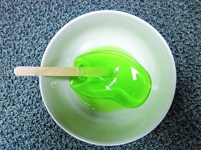 記者做了個實驗:將一支拆開了包裝的“綠舌頭”放在碗中,讓其慢慢融化。和一般雪糕融化成液體不一樣的是,一個小時之后,原本堅硬的“綠舌頭”變成了一塊軟軟的、粘滑的膠狀物,有點像果凍卻不易被攪碎,碗底還有少量的淡綠色的液體,記者湊近了,能聞到濃郁的香精香氣。不過,從配料表來看,這款“綠舌頭”的食品添加劑并不算多,僅有檸檬酸、增稠劑、食用香精、檸檬酸鈉、焦糖色、檸檬黃、亮藍7種,遠低于市場上其他“花哨” 的雪糕添加劑含量。 實習(xí)生 丁夢青 水玉涵 本報記者 楊彥