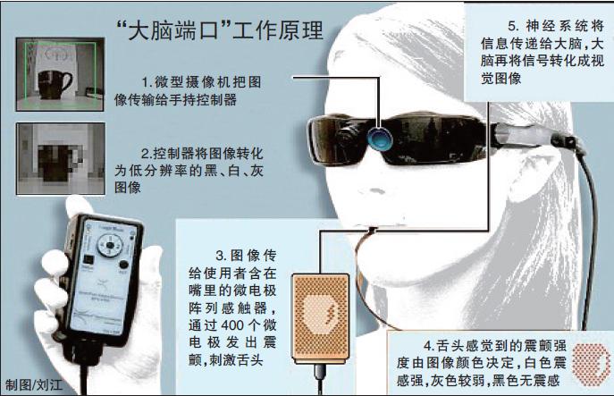 這項(xiàng)技術(shù)由美國威斯康星州的一家公司開發(fā),能夠幫助盲人通過一個(gè)名為“大腦端口”的儀器“看見”物體。該儀器通過一部攝像頭拍攝物體,然后將物體的信息轉(zhuǎn)化為電子信號,讓舌頭感到不同強(qiáng)度的震顫,最后由大腦將這些信號轉(zhuǎn)化為視覺圖像。預(yù)計(jì)每臺(tái)售價(jià)約1萬美元。