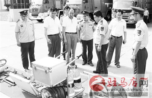 軍民魚(yú)水一家親,共建和諧雙擁城。八一建軍節(jié)即將來(lái)臨之際,開(kāi)發(fā)區(qū)黨委、管委會(huì)領(lǐng)導(dǎo)班子有關(guān)成員看望慰問(wèn)了駐馬店軍分區(qū)和該區(qū)公安消防大隊(duì)的官兵,分別為他們送去了節(jié)日慰問(wèn)金3萬(wàn)元和節(jié)日的祝福以及美好的祝愿。圖為慰問(wèn)成員在該區(qū)公安消防大隊(duì)參觀新型消防設(shè)備。 記者 唐