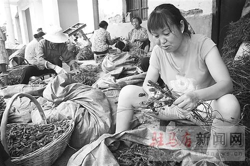 連日來(lái),何其正和王老吉等一些知名公司的業(yè)務(wù)員來(lái)到確山縣石滾河鎮(zhèn)中藥材收購(gòu)站收購(gòu)夏枯球,并把夏枯球穗和夏枯球稈分開(kāi)來(lái)收,僅此一項(xiàng),全鎮(zhèn)可收入1500萬(wàn)元以上,每畝比種糧增收千余元。據(jù)了解,一些夏枯球種植大戶每到夏枯球收購(gòu)時(shí)節(jié)都會(huì)聘請(qǐng)當(dāng)?shù)睾袜忇l(xiāng)的閑置育齡婦女來(lái)幫忙剪夏枯球穗,每剪穗1公斤可掙三四元錢(qián)。圖為該鎮(zhèn)很多村民在中藥材收購(gòu)站修剪夏枯球。 記者 吳 波 王 朝 攝影報(bào)道