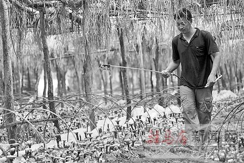 近年來,確山縣大力發(fā)展食用菌產(chǎn)業(yè),全縣有3000多戶農(nóng)民和50多名返鄉(xiāng)農(nóng)民工從事培植黑木耳、銀耳、香菇、靈芝等食(藥)用菌系列產(chǎn)品,年產(chǎn)值8000多萬元,產(chǎn)品出口到日本、韓國等國家。圖為該縣石滾河鎮(zhèn)農(nóng)民給食用靈芝噴水。 記者 吳 波 通訊員 張融冰 攝影報(bào)道