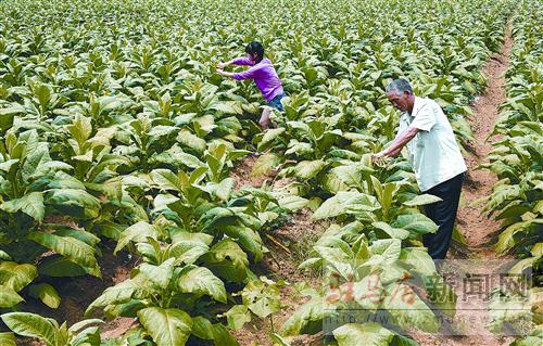 進(jìn)入7月份以來,確山縣種植的2萬多畝煙葉長勢良好。圖為該縣瓦崗鎮(zhèn)種植戶在對煙葉進(jìn)行田間管理。 記者 郭緒明 張新義 攝影報(bào)道