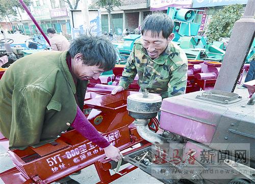 摘要: 又到三秋大忙、小麥備播時(shí),各種玉米脫粒機(jī)、小麥播種機(jī)等小型農(nóng)機(jī)正熱銷。9月27日,在西平縣農(nóng)機(jī)市場里,農(nóng)民李樹堂正在挑選稱心的農(nóng)機(jī)。 記者 弓華靜 攝